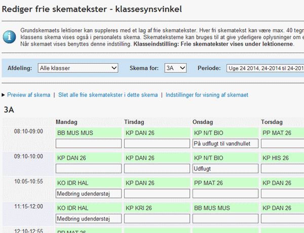 Grundskemaets lektioner kan suppleres med et lag af frie skematekster. Hver fri skematekst kan være max. 40 tegn.